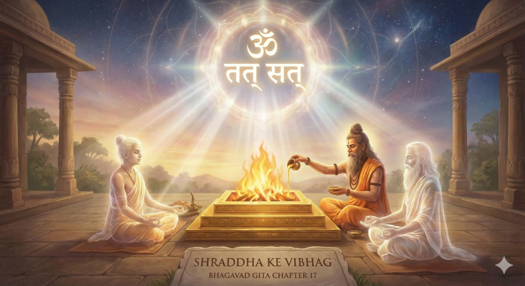 Chapter 17 of the Shreemad Bhagwad Geeta is named Shraddha ke Vibhag, where Lord Krishna explains to Arjuna the three kinds of worship according to the three gunas — Satoguna, Rajoguna, and Tamoguna.
